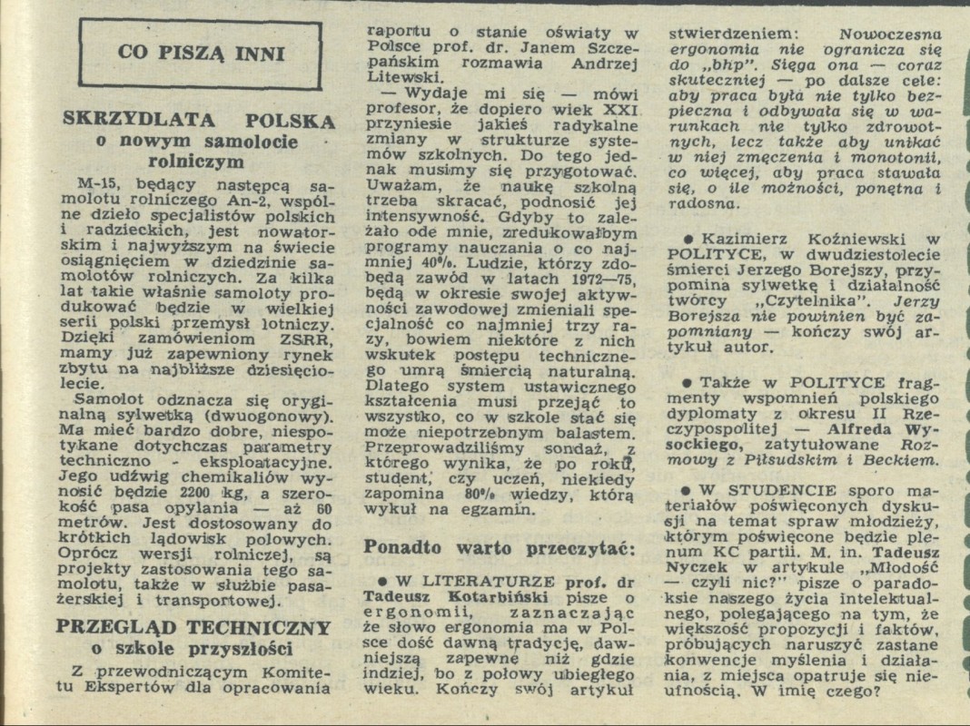 Archiwum / Co piszą inni nr 1442 (48/1972) 1/1 Podziel się Tytuł Co piszą inni Rubryka Co piszą inni Artykuł z numeru 1442 (48/1972) Data wydania 26 listopada 1972 Tagi nowy samolot rolniczy system szkolnictwa