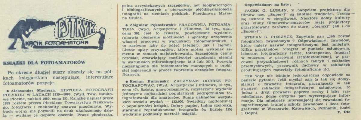 Archiwum / Fotografia nr 1457 (10/1973) 79/83 Podziel się Tytuł Pstryk - kącik fotoamatora Autor F.OTO Kategoria Fotografia Artykuł z numeru 1457 (10/1973) Data wydania 11 marca 1973