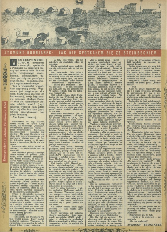 Archiwum / korespondencja własna "Przekroju" nr 928 (03/1963) 77/294 Podziel się Tytuł Jak nie spotkałem się ze Steinbeckiem Autor Zygmunt Broniarek Rubryka korespondencja własna "Przekroju" Artykuł z numeru 928 (3/1963) Data wydania 20 stycznia 1963