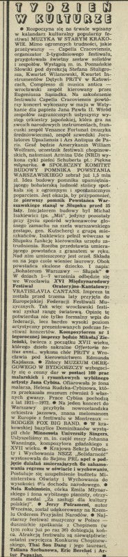 Archiwum / Tydzień w kulturze nr 1897 (33/1981) 23/121 Podziel się Tytuł Tydzień w kulturze Rubryka Tydzień w kulturze Artykuł z numeru 1897 (33/1981) Data wydania 16 sierpnia 1981 Tagi Muzyka w Starym Krakowie Vratislavia Cantants Jan Cybis