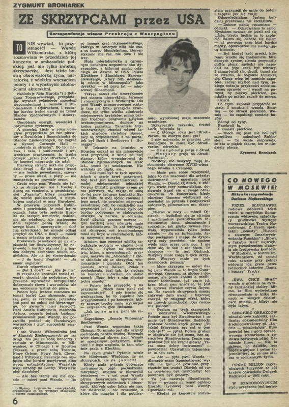 Archiwum / korespondencja własna "Przekroju" nr 926 (01/1963) 87/129 Podziel się Tytuł Ze skrzypcami przez USA Autor Zygmunt Broniarek Rubryka korespondencja własna "Przekroju" Artykuł z numeru 926 (1/1963) Data wydania 6 stycznia 1963 Tagi Wanda Wiłkomirska