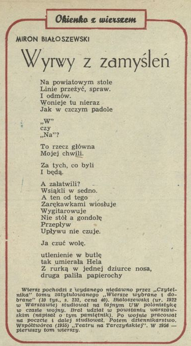 Archiwum / Okienko z wierszem nr 1898 (34/1981) 75/692 Podziel się Tytuł Wyrwy z zamyśleń Autor Miron Białoszewski Rubryka Okienko z wierszem Artykuł z numeru 1898 (34/1981) Data wydania 23 sierpnia 1981 Tagi wiersz