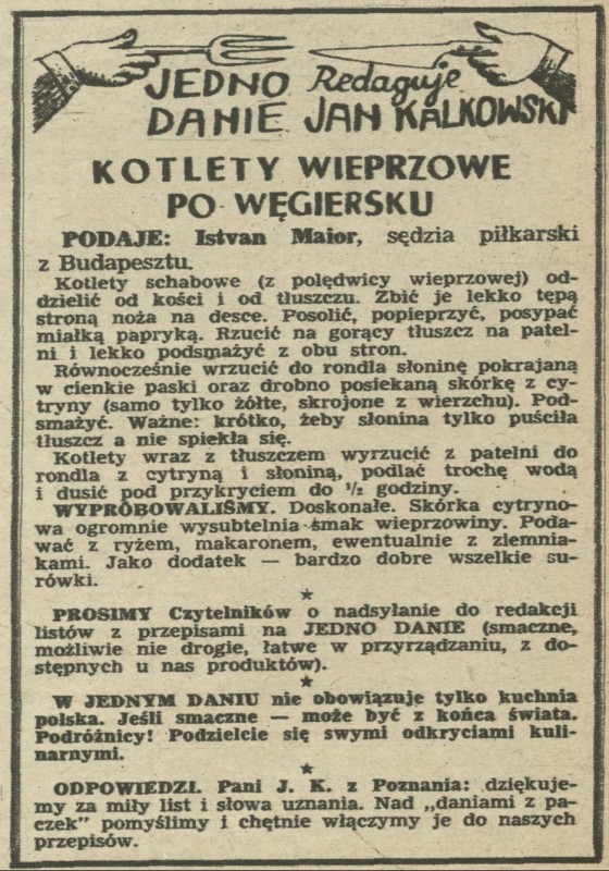 Archiwum / Jedno danie nr 877 (04/1962) 02/25 Podziel się Tytuł Kotlety wieprzowe po węgiersku Autor Jan Kalkowski Rubryka Jedno danie Artykuł z numeru 877 (4/1962) Data wydania 28 stycznia 1962 Tagi gastronomia kulinaria przepis kulinarny kuchnia węgierska kotlety schabowe