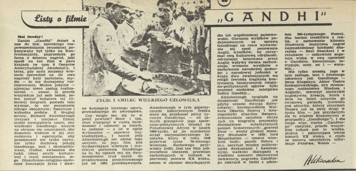 Archiwum / Listy o filmie nr 2066 (02/1985) 84860/123969 Podziel się Tytuł Listy o filmie Autor Aleksandra Rubryka Listy o filmie Artykuł z numeru 2066 (2/1985) Data wydania 13 stycznia 1985 Tagi "Gandhi"