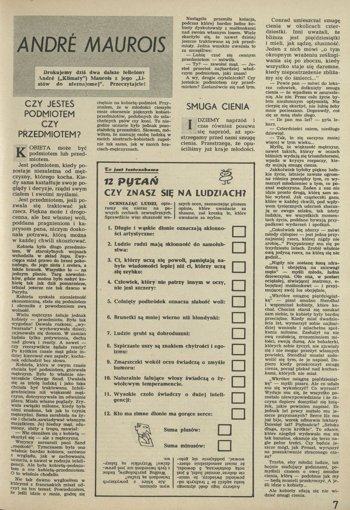 Archiwum / Felieton nr 798 (30/1960) 65/650 Podziel się Tytuł Czy jesteś podmiotem czy przedmiotem, Smuga cienia Autor Andre Maurois Kategoria Felieton Artykuł z numeru 798 (30/1960) Data wydania 22 lipca 1960 Tagi kobiety życie