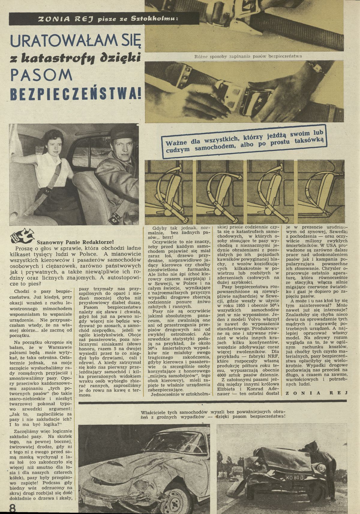Archiwum / Listy do i od redakcji nr 865 (45/1961) 36038/123969 Podziel się Tytuł Uratowałam się z katastrofy dzięki pasom bezpieczeństwa! Autor Rej Zonia Rubryka Listy do i od redakcji Artykuł z numeru 865 (45/1961) Data wydania 5 listopada 1961