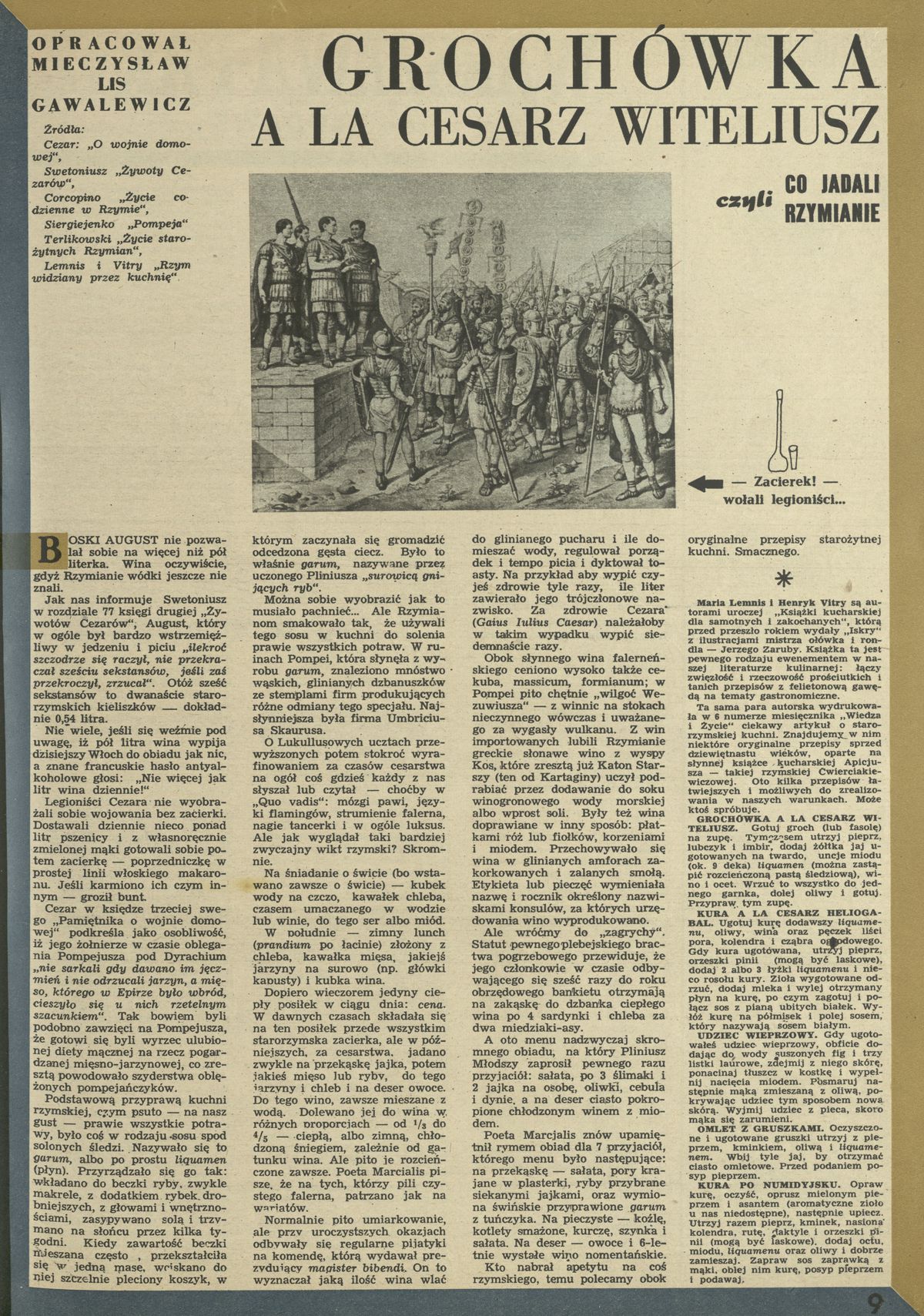 Archiwum / Różności nr 803 (35/1960) 33099/123969 Podziel się Tytuł Grochówka a la cesarz Witeliusz czyli co jadali Rzymianie Autor Mieczysław Lis-Gawalewicz Kategoria Różności Artykuł z numeru 803 (35/1960) Data wydania 28 sierpnia 1960 Tagi kuchnia starożytny Rzym historia