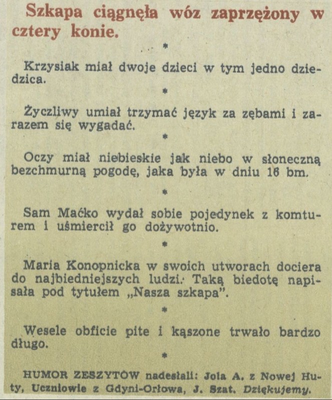 Archiwum / Humor zeszytów szkolnych nr 1444 (50/1972) 59216/123969 Podziel się Tytuł [Szkapa ciągnęła wóz zaprzężony w cztery konie...] Rubryka Humor zeszytów szkolnych Artykuł z numeru 1444 (50/1972) Data wydania 10 grudnia 1972 Tagi humor zeszytów szkolnych rozmaitości