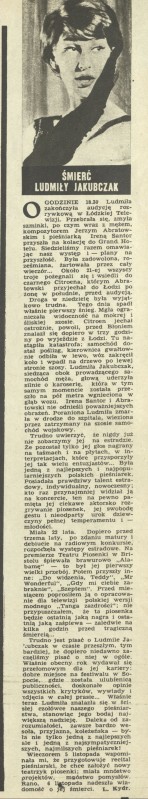 Archiwum / Artykuł nr 867 (47/1961) 35066/121061 Podziel się Tytuł Śmierć Ludmiły Jakubczak Autor Lucjan Kydryński Kategoria Artykuł Artykuł z numeru 867 (47/1961) Data wydania 19 listopada 1961