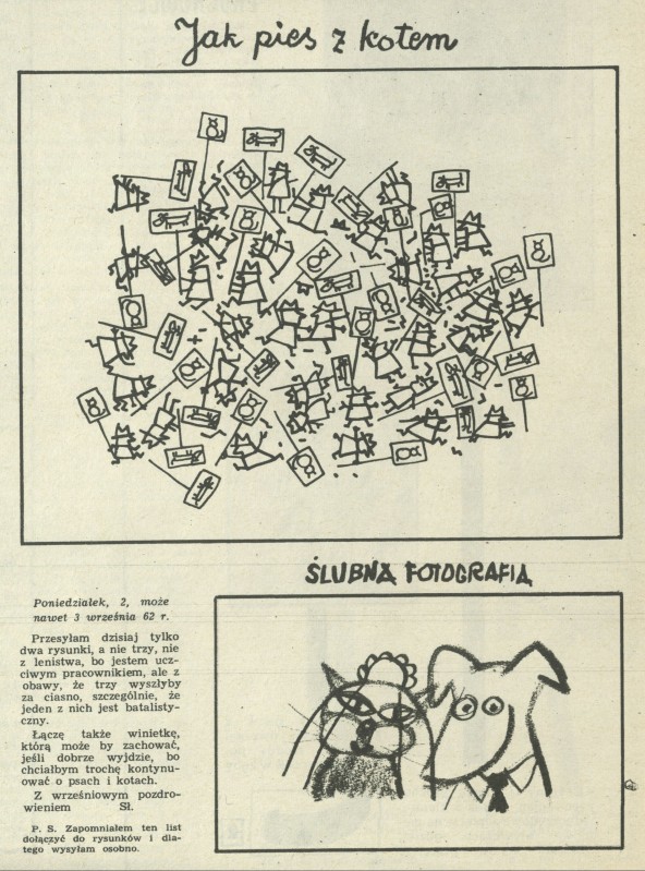 Archiwum / Przez okulary Sławomira Mrożka nr 910 (37/1962) 91/354 Podziel się Tytuł Jak pies z kotem Autor Sławomir Mrożek Rubryka Przez okulary Sławomira Mrożka Artykuł z numeru 910 (37/1962) Prawa Diogenes Verlag AG Data wydania 16 września 1962 Tagi satyra absurd żart rysunkowy ślubna fotografia