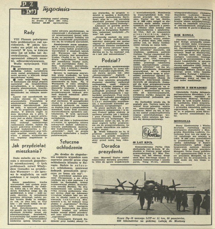 Archiwum / Przekrój tygodnia nr 848 (28/1961) 461/954 Podziel się Tytuł Przekrój tygodnia Rubryka Przekrój tygodnia Artykuł z numeru 848 (28/1961) Data wydania 9 lipca 1961 Tagi Plenum PZPR polityka PRL mieszkania ochłodzenie klimatu Maxwell Taylor ił-18 samolot pasażerski