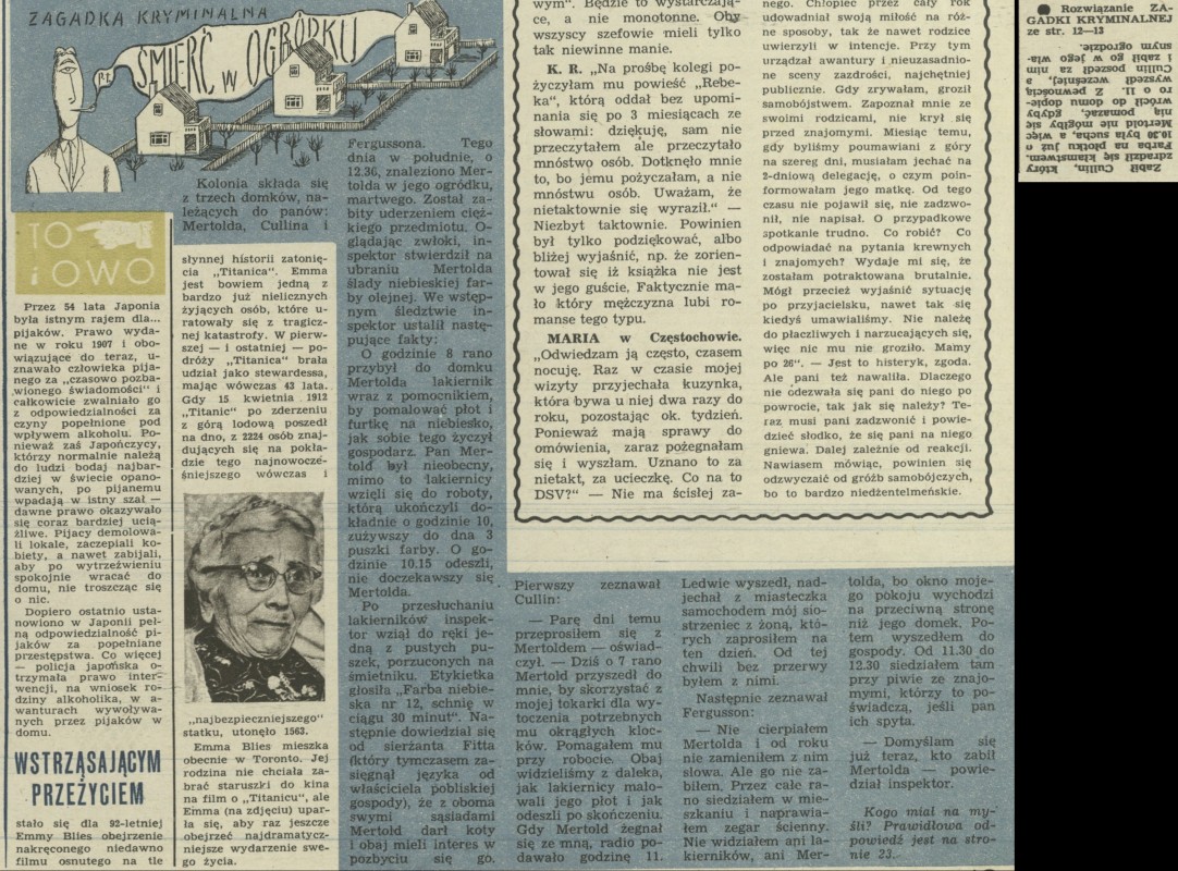 Archiwum / Zagadka kryminalna nr 848 (28/1961) 35180/123969 Podziel się Tytuł Śmierć w ogródku Rubryka Zagadka kryminalna Artykuł z numeru 848 (28/1961) Data wydania 9 lipca 1961 Tagi zagadka zgadywanka