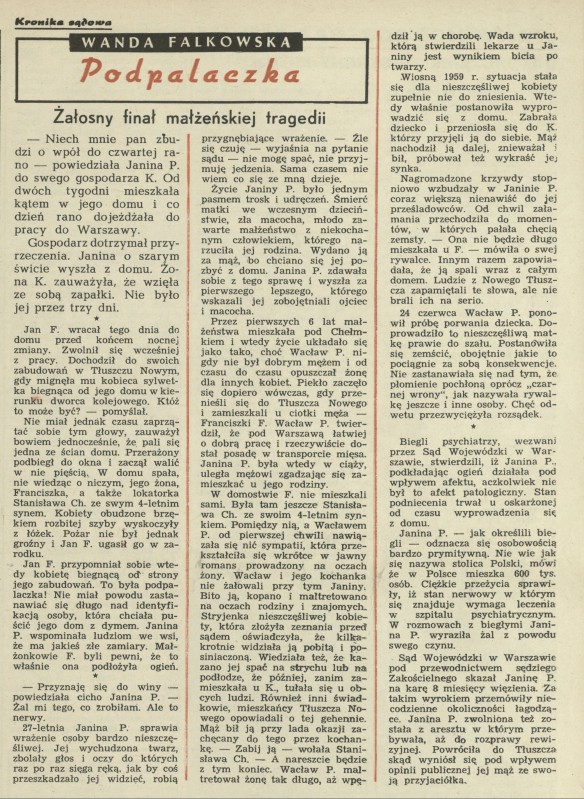 Archiwum / Kronika sądowa nr 809 (41/1960) 05/33 Podziel się Tytuł Podpalaczka. Żałosny finał małżeńskiej tragedii Autor Wanda Falkowska Rubryka Kronika sądowa Artykuł z numeru 809 (41/1960) Data wydania 9 października 1960 Tagi prawo wymiar sprawiedliwości sąd kodeks karny
