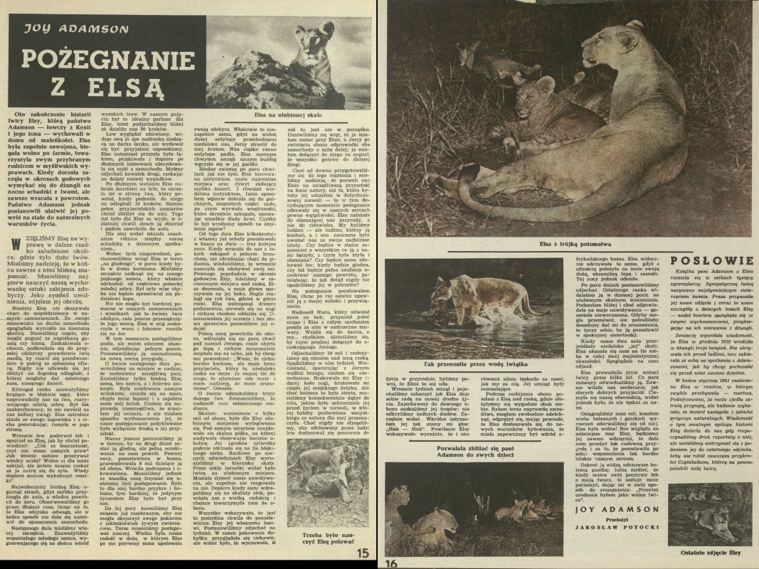 Archiwum / Proza nr 830 (10/1961) 13/15 Podziel się Tytuł Pożegnanie z Elsą Autor Joy Adamson Jarosław Potocki Kategoria Proza Artykuł z numeru 830 (10/1961) Data wydania 5 marca 1961 Tagi zwierzęta Kenia Afryka "Elza z afrykańskiego buszu"