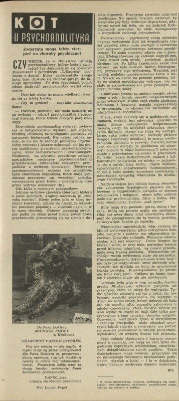 Archiwum / Różności nr 779 (11/1960) 161/592 Podziel się Tytuł Kot u psychoanalityka Autor F. Kategoria Różności Artykuł z numeru 779 (11/1960) Data wydania 13 marca 1960