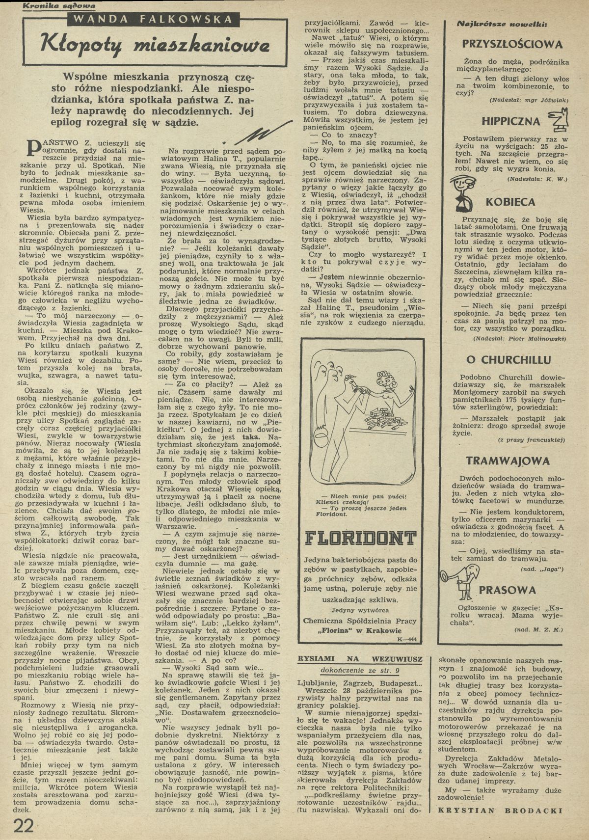 Archiwum / Kronika sądowa nr 779 (11/1960) 08/37 Podziel się Tytuł Kłopoty mieszkaniowe Autor Wanda Falkowska Rubryka Kronika sądowa Artykuł z numeru 779 (11/1960) Data wydania 13 marca 1960