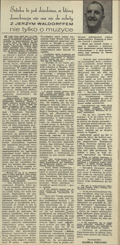 Archiwum / Wywiad nr 1908 (44/1981) 6/6 Podziel się Tytuł Sztuka to jest dziedzina, w której demokracja nie ma nic do roboty Autor Izabela Pieczara Kategoria Wywiad Artykuł z numeru 1908 (44/1981) Data wydania 1 listopada 1981 Tagi Jerzy Waldorff Teatr Wielki muzyka