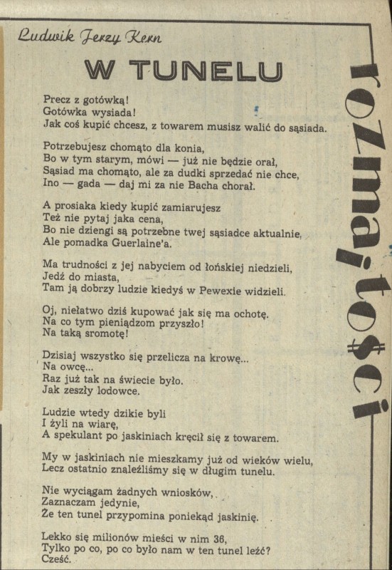 Archiwum / Rozmaitości [old] nr 1908 (44/1981) 33/39 Podziel się Tytuł W tunelu Autor Ludwik Jerzy Kern Rubryka Rozmaitości [old] Artykuł z numeru 1908 (44/1981) Data wydania 1 listopada 1981 Tagi Ludwik Jerzy Kern poezja