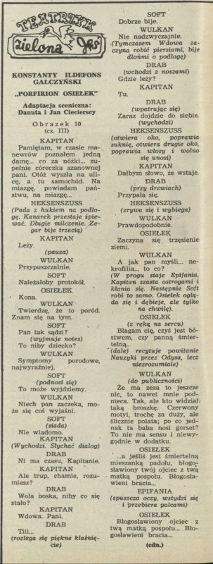 Archiwum / Teatrzyk Zielona Gęś nr 2070 (06/1985) 07/36 Podziel się Tytuł Porfirion Osiełek Autor Konstanty Ildefons Gałczyński Rubryka Teatrzyk Zielona Gęś Artykuł z numeru 2070 (6/1985) Data wydania 10 lutego 1985 Tagi groteska humor scenka rodzajowa gag