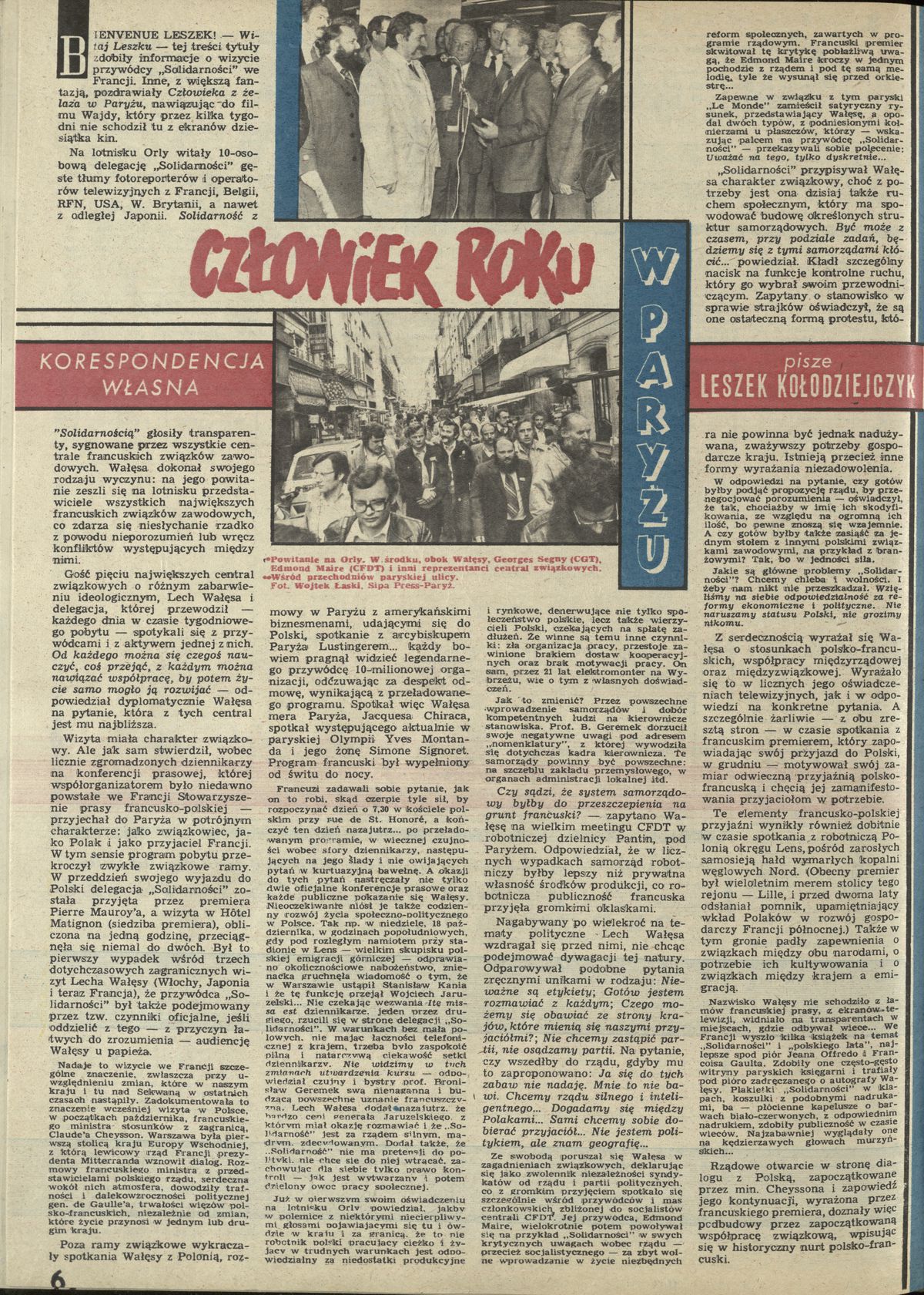 Archiwum / korespondencja własna "Przekroju" nr 1909 (45/1981) 08/61 Podziel się Tytuł Człowiek Roku Autor Leszek Kołodziejczyk Rubryka korespondencja własna "Przekroju" Artykuł z numeru 1909 (45/1981) Data wydania 8 listopada 1981 Tagi Paryż Lech Wałęsa