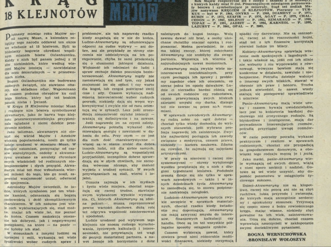 Archiwum / Różności nr 2006 (47/1983) 1/1 Podziel się Tytuł Horoskop Majów. Krąg 18 klejnotów Autor Bogna Wernichowska, Bronisław Wołoszyn Kategoria Różności Artykuł z numeru 2006 (47/1983) Data wydania 20 listopada 1983 Tagi horoskop Majów klejnoty akwamaryn