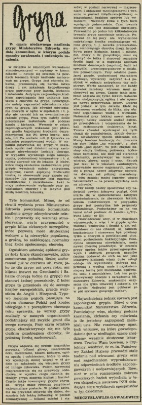 Archiwum / Różności nr 305 (07/1951) 9827/123969 Podziel się Tytuł Grypa Autor Mieczysław Lis-Gawalewicz Kategoria Różności Artykuł z numeru 305 (7/1951) Data wydania 11 lutego 1951 Tagi zdrowie medycyna