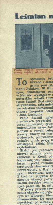 Archiwum / Kultura nr 1802 (42/1979) 1/2 Podziel się Tytuł Leśmian na równiku Kategoria Kultura Artykuł z numeru 1802 (42/1979) Data wydania 21 października 1979 Tagi Nairobi Pomianowski Lechoń