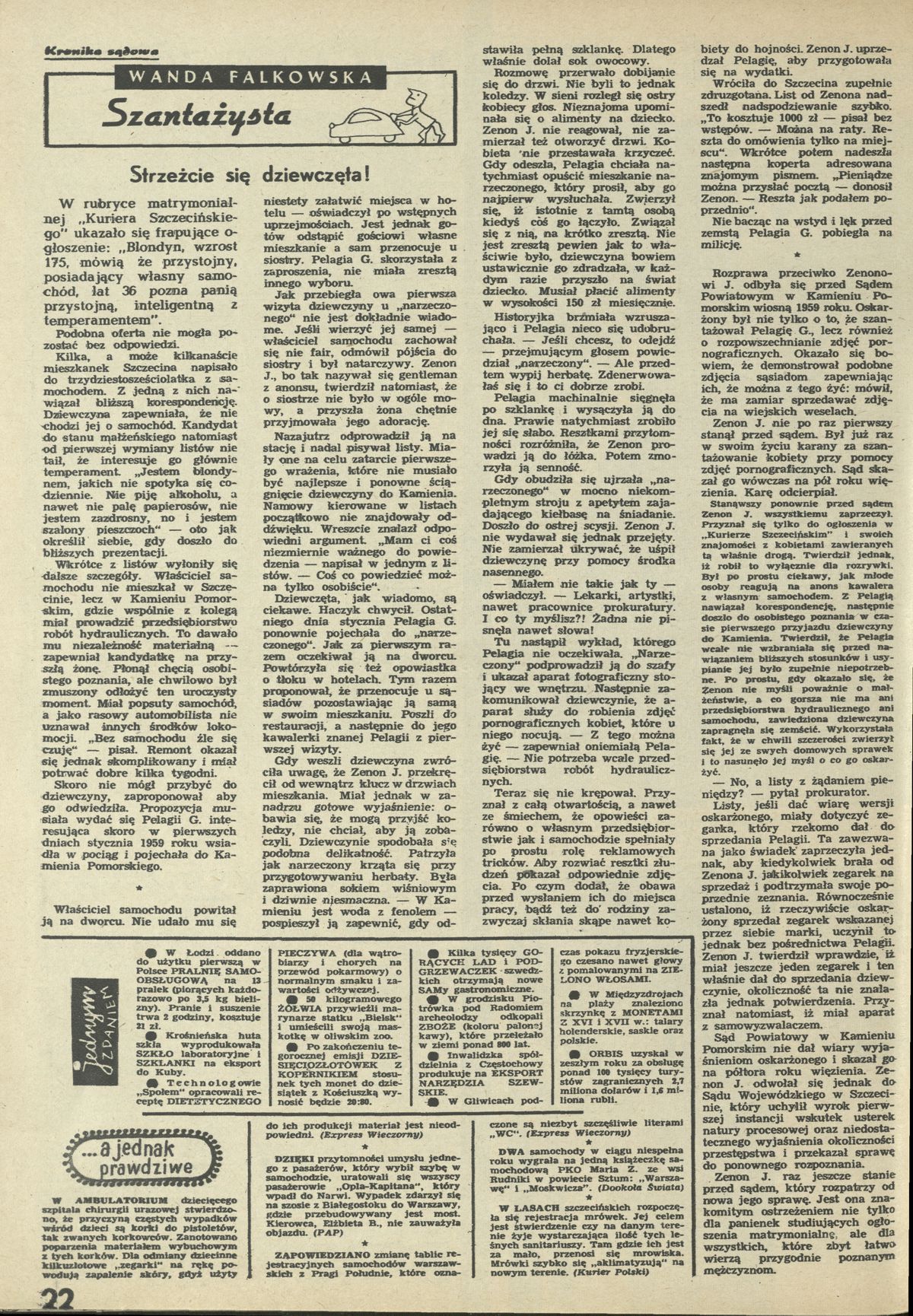 Archiwum / Kronika sądowa nr 838 (18/1961) 86/836 Podziel się Tytuł Szantażysta Autor Wanda Falkowska Rubryka Kronika sądowa Artykuł z numeru 838 (18/1961) Data wydania 30 kwietnia 1961