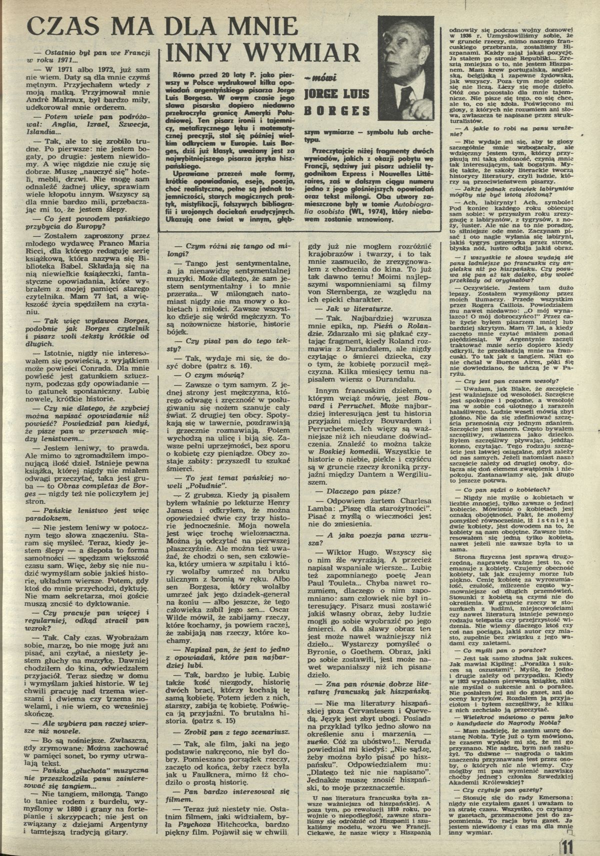 Archiwum / Wywiad nr 1678 (23/1977) 47/86 Podziel się Tytuł Czas ma dla mnie inny wymiar. Autor Jorge Luis Borges Kategoria Wywiad Artykuł z numeru 1678 (23/1977) Data wydania 5 czerwca 1977 Tagi nauka literatura