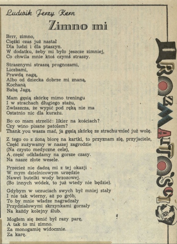 Archiwum / Rozmaitości [old] nr 1912 (48/1981) 37/39 Podziel się Tytuł Zimno mi Autor Ludwik Jerzy Kern Rubryka Rozmaitości [old] Artykuł z numeru 1912 (48/1981) Data wydania 29 listopada 1981 Tagi Ludwik Jerzy Kern poezja