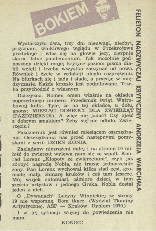Archiwum / Felieton nr 1493 (46/1973) 62108/123969 Podziel się Tytuł Bokiem Autor Andrzej Warchał Kategoria Felieton Artykuł z numeru 1493 (46/1973) Data wydania 18 listopada 1973