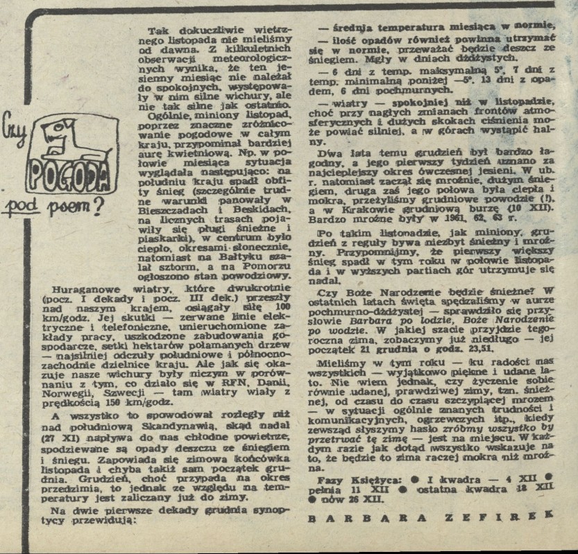 Archiwum / Czy pogoda pod psem? nr 1913 (49/1981) 26/426 Podziel się Tytuł Czy pogoda pod psem? Autor Barbara Zefirek Rubryka Czy pogoda pod psem? Artykuł z numeru 1913 (49/1981) Data wydania 6 grudnia 1981 Tagi prognoza pogody