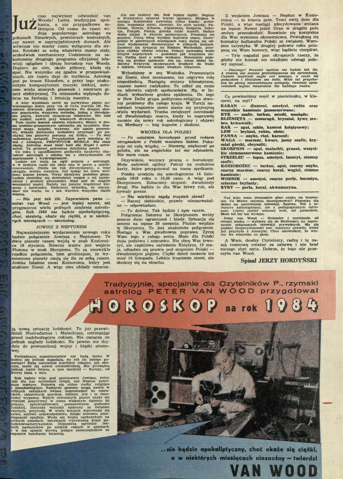 Archiwum / Rozrywka nr 2012 (01/1984) 05/1668 Podziel się Tytuł Horoskop na rok 1984 Autor Peter Van Wood, Jerzy Hordyński Kategoria Rozrywka Artykuł z numeru 2012 (1/1984) Data wydania 1 stycznia 1984 Tagi horoskop na rok 1984 astrologia spojrzenie w przyszłość