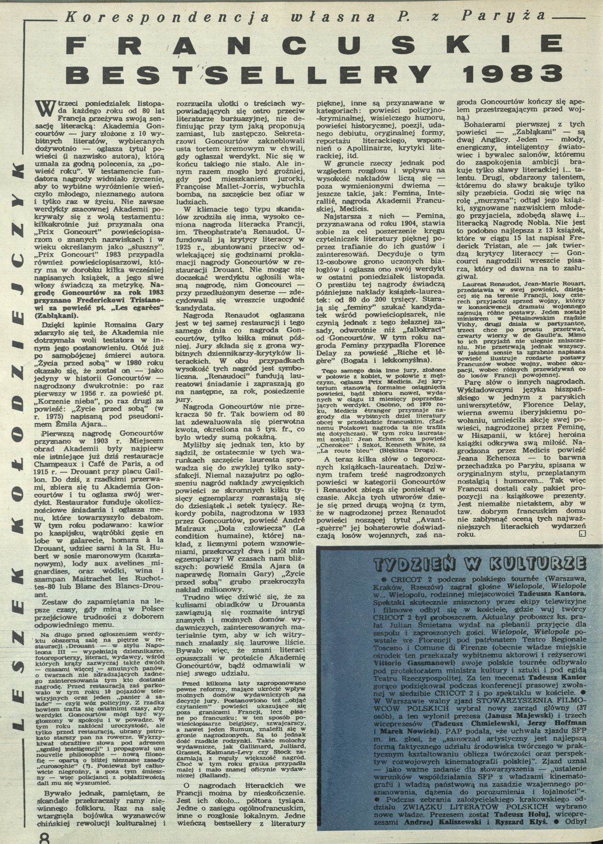 Archiwum / korespondencja własna "Przekroju" nr 2012 (01/1984) 154/513 Podziel się Tytuł Francuskie bestsellery 1983 Autor Leszek Kołodziejczyk Rubryka korespondencja własna "Przekroju" Artykuł z numeru 2012 (1/1984) Data wydania 1 stycznia 1984 Tagi nagrody literackie we Francji nagroda Goncourtów książki bestsellery