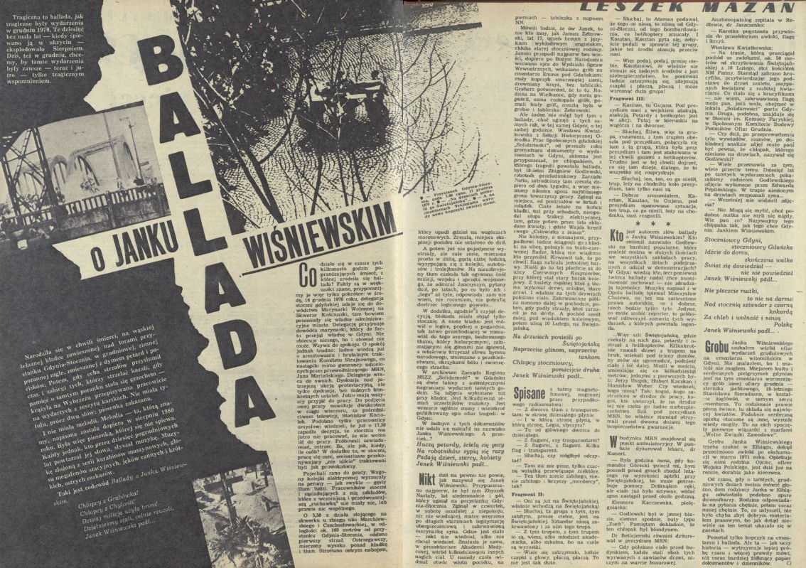 Archiwum / Reportaż nr 1914 (50/1981) 190/741 Podziel się Tytuł Ballada o Janku Wisniewskim Autor Leszek Mazan Kategoria Reportaż Artykuł z numeru 1914 (50/1981) Data wydania 13 grudnia 1981 Tagi Janek Wiśniewski grudzień 1970 Janek Wiśniewski padł