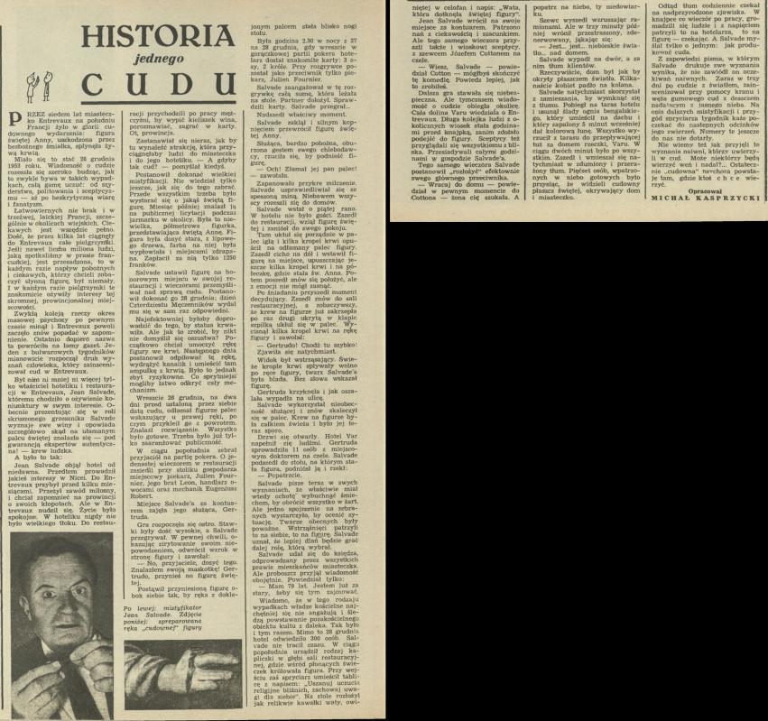 Archiwum / Artykuł nr 829 (09/1961) 06/43 Podziel się Tytuł Historia jednego cudu Autor Michał Kasprzycki Kategoria Artykuł Artykuł z numeru 829 (9/1961) Data wydania 26 lutego 1961 Tagi mistyfikacja religia
