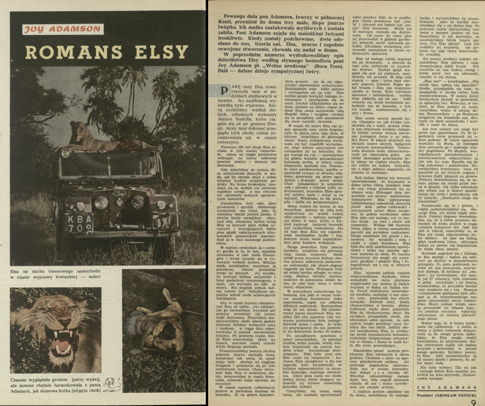 Archiwum / Fotoreportaż nr 829 (09/1961) 2/3 Podziel się Tytuł Romans Elsy Autor Joy Adamson Jarosław Potocki Kategoria Fotoreportaż Artykuł z numeru 829 (9/1961) Data wydania 26 lutego 1961 Tagi zwierzęta Kenia Afryka "Elza z afrykańskiego buszu"