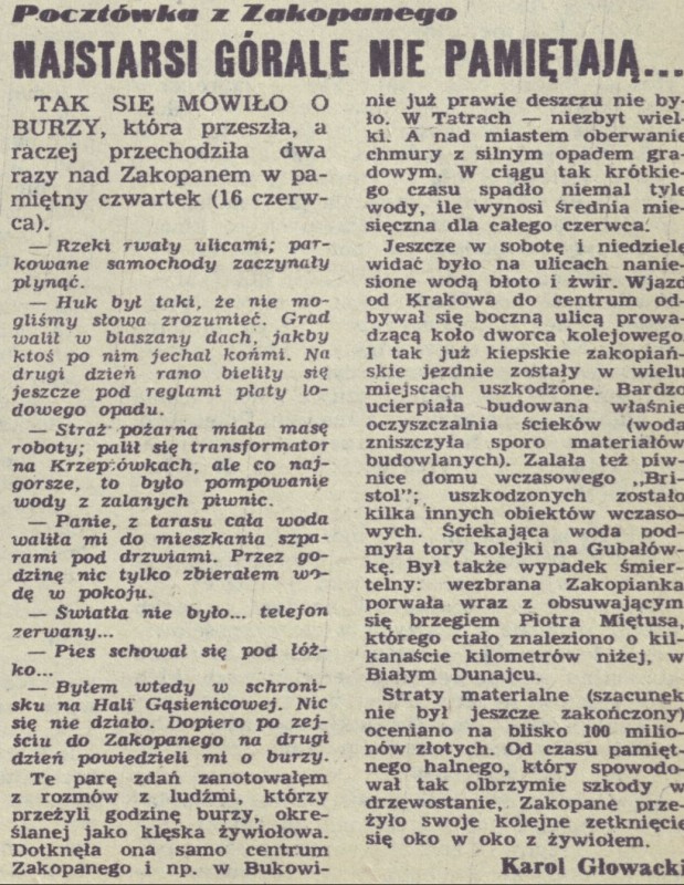 Archiwum / Korespondencja nr 1681 (26/1977) 70477/123969 Podziel się Tytuł Pocztówka z Zakopanego Autor Karol Głowacki Kategoria Korespondencja Artykuł z numeru 1681 (26/1977) Data wydania 26 czerwca 1977 Tagi zakopane burza
