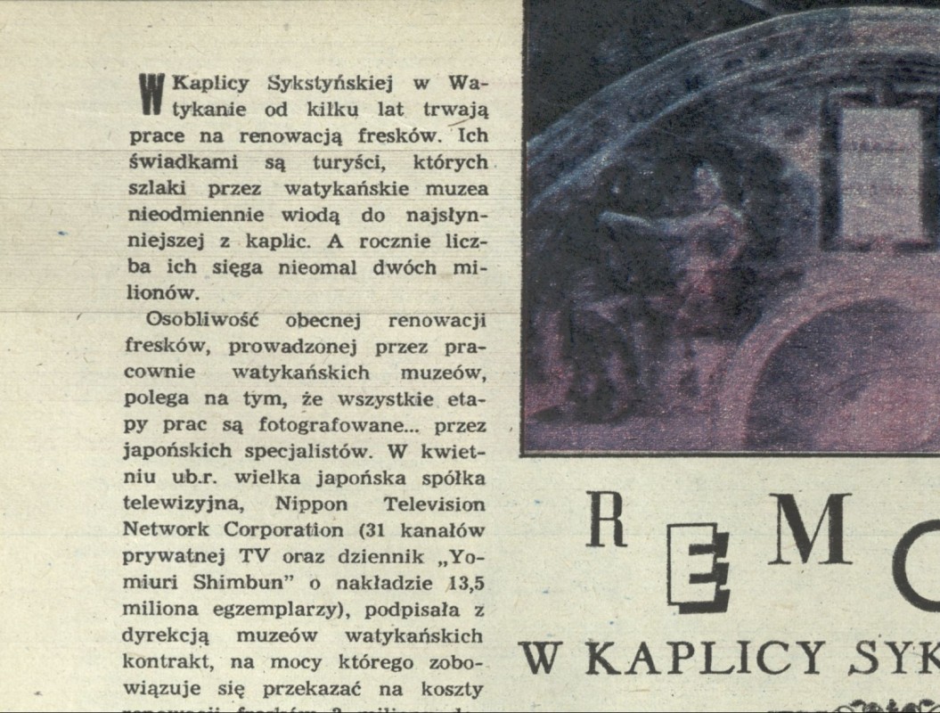 Archiwum / Kultura nr 2013 (02/1984) 82752/123969 Podziel się Tytuł Remont w Kaplicy Sykstyńskiej Kategoria Kultura Artykuł z numeru 2013 (2/1984) Data wydania 8 stycznia 1984 Tagi Kaplica Sykstyńska remont