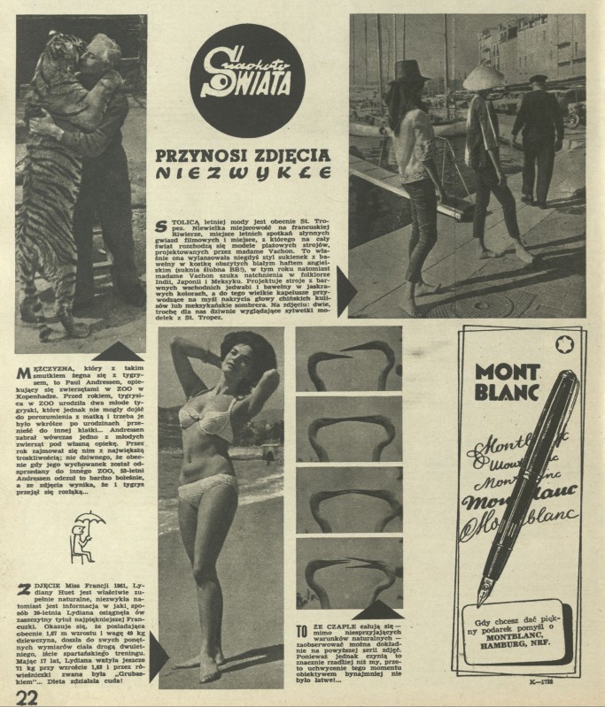 Archiwum / Naokoło świata nr 848 (28/1961) 2/4 Podziel się Tytuł Naokoło świata Rubryka Naokoło świata Artykuł z numeru 848 (28/1961) Data wydania 9 lipca 1961 Tagi Saint Tropez Paul Andressen Zoo w Kopenhadze Lydiana Huet czaple