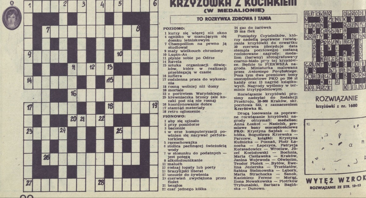 Archiwum / Krzyżówka z kociakiem nr 1681 (26/1977) 26/49 Podziel się Tytuł Krzyżówka z kociakiem Rubryka Krzyżówka z kociakiem Artykuł z numeru 1681 (26/1977) Data wydania 26 czerwca 1977 Tagi krzyżówka