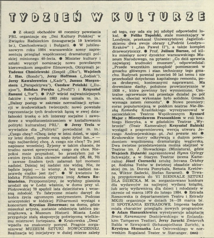 Archiwum / Tydzień w kulturze nr 2014 (03/1984) 1/3 Podziel się Tytuł Tydzień w kulturze Autor ms Rubryka Tydzień w kulturze Artykuł z numeru 2014 (3/1984) Data wydania 15 stycznia 1984 Tagi nadanie łódzkiej filharmonii im. Artura Rubinsteina Adam Hanuszkiewicz Bracia Karamazow
