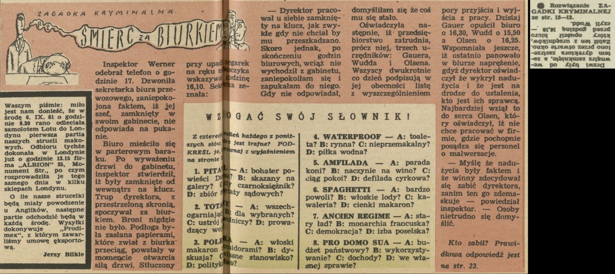 Archiwum / Zagadka kryminalna nr 859 (39/1961) 35750/123969 Podziel się Tytuł Śmierć za biurkiem Rubryka Zagadka kryminalna Artykuł z numeru 859 (39/1961) Data wydania 24 września 1961
