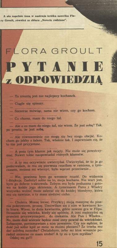 Archiwum / Proza nr 1931 (17/1982) 111/345 Podziel się Tytuł Pytanie z odpowiedzią Autor Flora Groult Kategoria Proza Artykuł z numeru 1931 (17/1982) Data wydania 13 czerwca 1982 Tagi Flora Groult nowelka