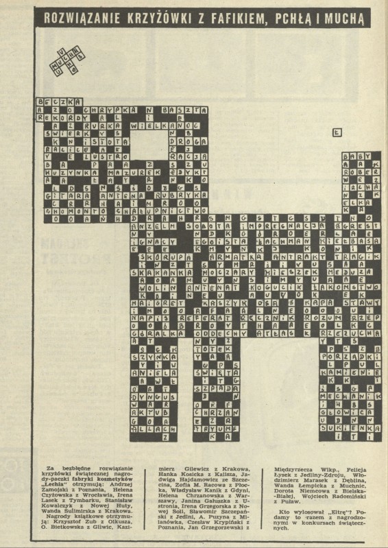 Archiwum / Krzyżówka nr 837 (17/1961) 62/341 Podziel się Tytuł Rozwiązanie krzyżówki z Fafikiem, pchłą i muchą Rubryka Krzyżówka Artykuł z numeru 837 (17/1961) Data wydania 23 kwietnia 1961