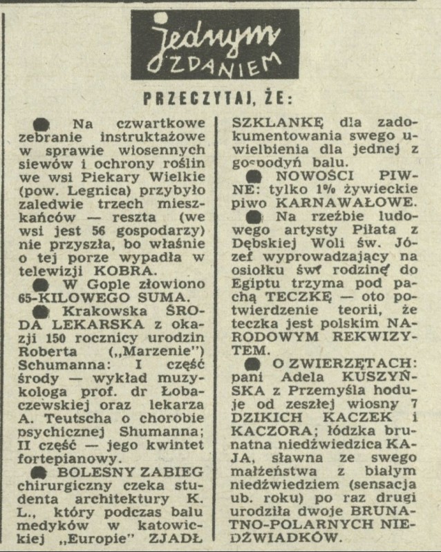 Archiwum / Jednym zdaniem nr 882 (09/1962) 11/86 Podziel się Tytuł Jednym zdaniem Rubryka Jednym zdaniem Artykuł z numeru 882 (9/1962) Data wydania 4 marca 1962