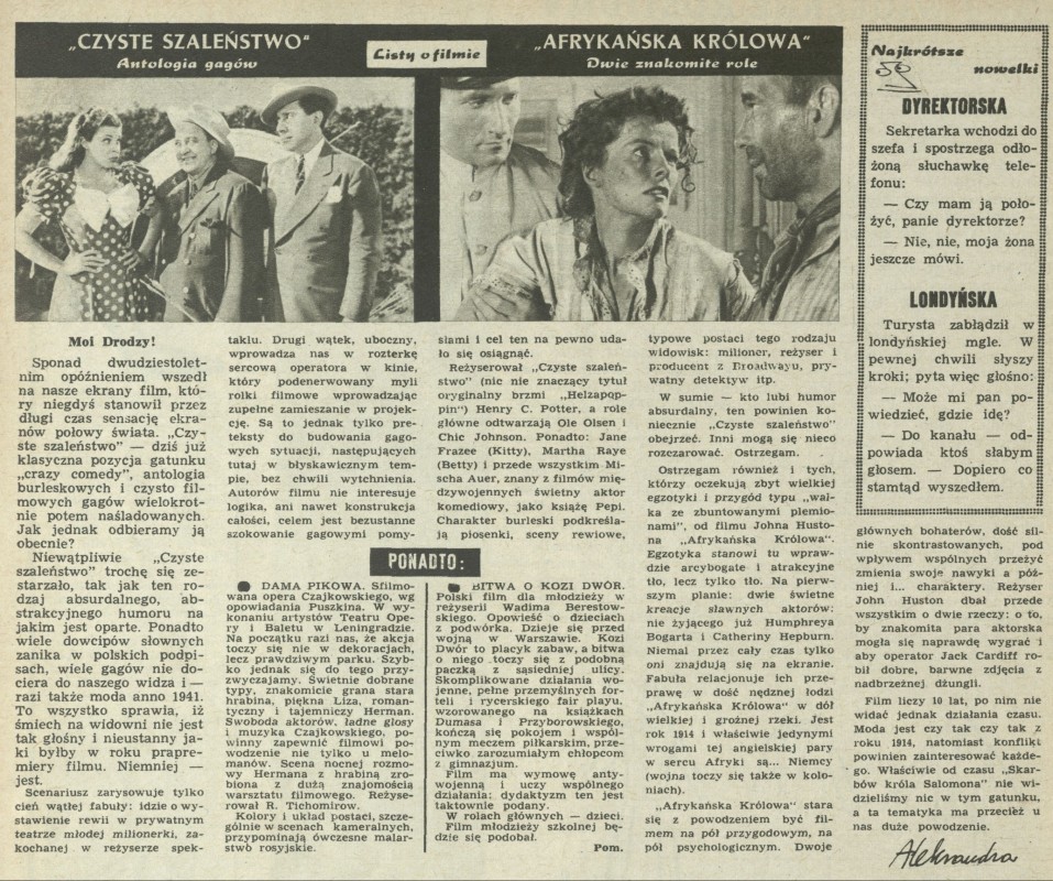 Archiwum / Listy o filmie nr 882 (09/1962) 245/1624 Podziel się Tytuł Listy o filmie Autor Aleksandra Rubryka Listy o filmie Artykuł z numeru 882 (9/1962) Data wydania 4 marca 1962 Tagi Czyste szaleństwo Afrykańska królowa