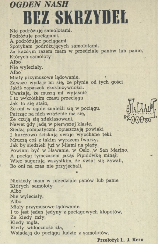 Archiwum / Rozmaitości nr 853 (33/1961) 35473/123969 Podziel się Tytuł Bez skrzydeł Autor Ogden Nash Ludwik Jerzy Kern Rubryka Rozmaitości Artykuł z numeru 853 (33/1961) Data wydania 13 sierpnia 1961 Tagi wiersz