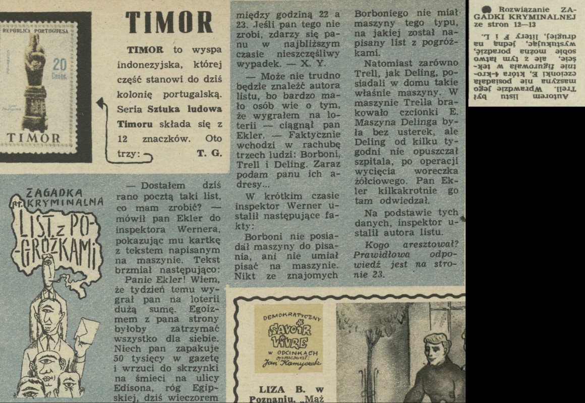 Archiwum / Zagadka kryminalna nr 894 (21/1962) 123/432 Podziel się Tytuł List z pogróżkami Rubryka Zagadka kryminalna Artykuł z numeru 894 (21/1962) Data wydania 27 maja 1962