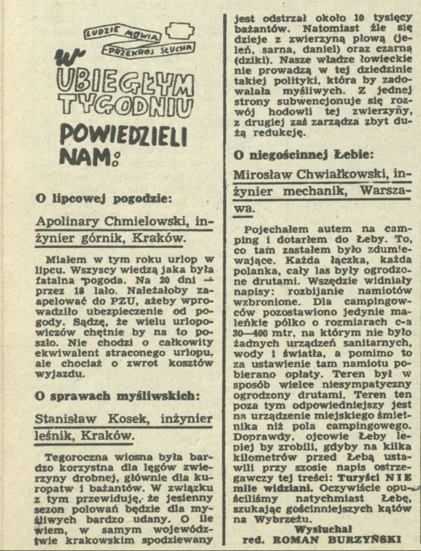 Archiwum / Ludzie mówią Przekrój słucha nr 852 (32/1961) 251/1298 Podziel się Tytuł W tym tygodniu powiedzieli nam Autor Roman Burzyński Rubryka Ludzie mówią Przekrój słucha Artykuł z numeru 852 (32/1961) Data wydania 6 sierpnia 1961 Tagi pogoda myśliwi polowanie łeba